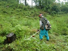 使用道具として一般的に作業効率が良い刈払機が使用されます。刈払機は先端に回転鋸の付いた電動式の器具です。能率は最も良いですが、植栽木に損傷を与えやすく、岩石が多いところでの使用が難しいです。
