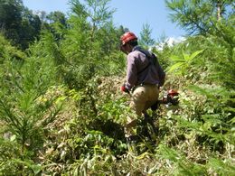 下刈りの時期としては6月下旬〜7月下旬と8月中旬が最適な時期となります。なぜ真夏の厳しい時期に下刈りをする必要があるかといいますと、雑草木の成長速度がピークに達し、また雑草木が前年に蓄えた養分を使い切ってこれから翌年の成長に必要な養分を蓄えようとしてしている時期であり、高温多湿になると、埋もれた植物が生理障害を起こし、衰弱、枯死する場合があるためです。