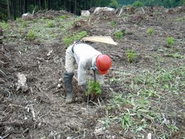 地拵えが終わったらいよいよ苗の植え付けです。植えつける時期はあまり暑くない春や秋が多いです。苗木は山の斜面に手作業で1本ずつ植えていきます。苗木はある程度密集させた方が早く真っ直ぐに上に向かって伸びます。